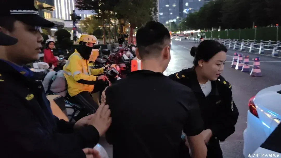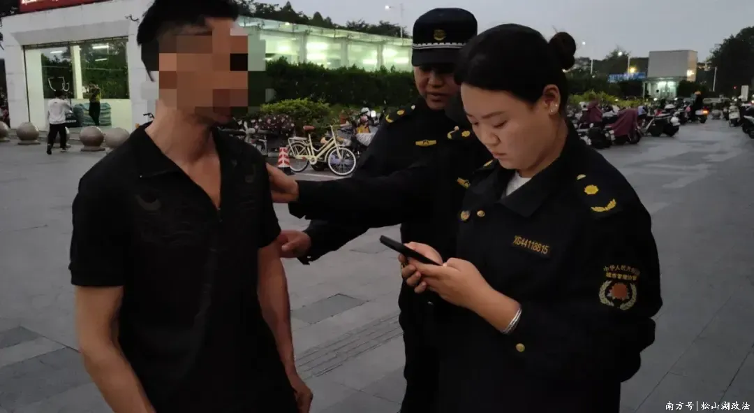 下午5点30分许,松山湖城管分局市容整治专班的5名城管队员,在万象汇商业区开展环境卫生巡查工作,当来到松山湖北站出入口的时候,发现一名中年男子站在路边,眼神迟钝,身体摇晃,而且双手一直在颤抖,随时可能晕倒。紧急时刻,城管队员马上冲过去扶住男子,耐心安抚情绪的同时询问对方是否需要帮助。